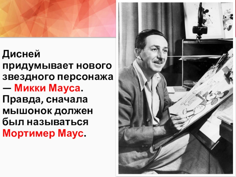 Слайд 10Дисней придумывает нового звездного персонажа — Микки Мауса. Правда, сначала мышонок должен