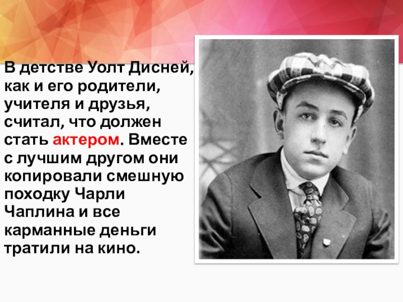 В детстве Уолт Дисней, как и его родители, учителя и друзья, считал, что должен стать актером. Вместе с