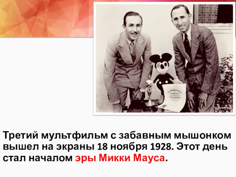 Слайд 11Третий мультфильм с забавным мышонком вышел на экраны 18 ноября 1928.