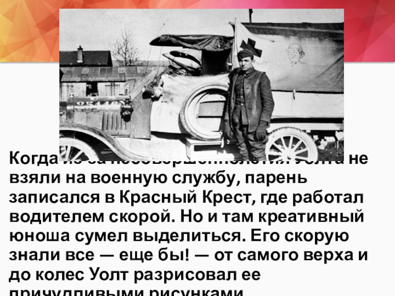 в Красный Крест, где работал водителем скорой. Но и там креативный юноша сумел выделиться. Его скорую знали все — еще бы! — от самого верха и до колес Уолт разрисовал ее причудливыми рисунками.