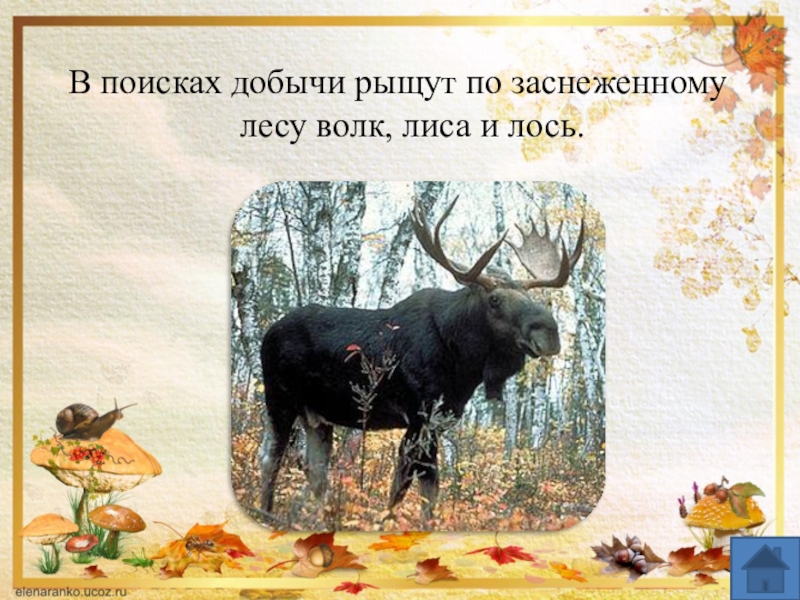 Слайд 15В поисках добычи рыщут по заснеженному лесу волк, лиса и лось.