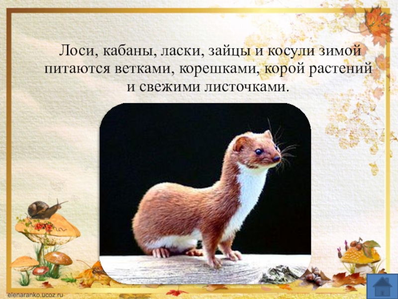 Слайд 16 Лоси, кабаны, ласки, зайцы и косули зимой питаются ветками, корешками,