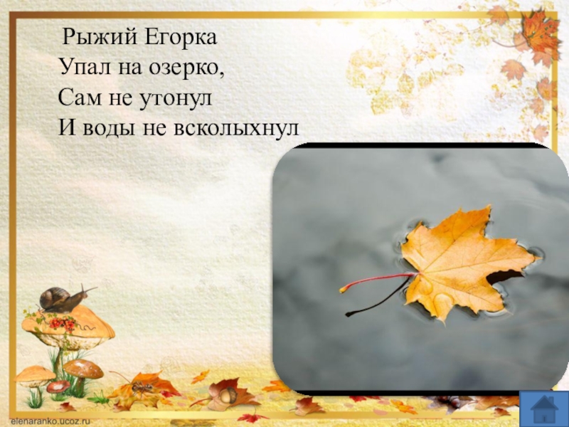 Слайд 6 Рыжий Егорка Упал на озерко, Сам не утонул И воды не всколыхнул