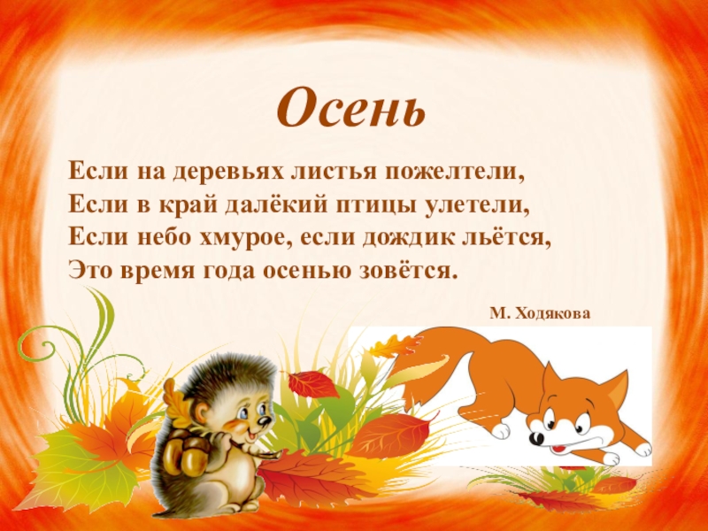 ОсеньМ. ХодяковаЕсли на деревьях листья пожелтели,Если в край далёкий птицы улетели,Если небо хмурое, если дождик льётся,Это время года осенью зовётся.