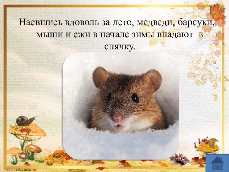 Слайд 14 Наевшись вдоволь за лето, медведи, барсуки, мыши и ежи в начале