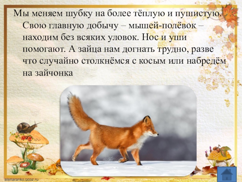 Мы меняем шубку на более тёплую и пушистую. Свою главную добычу – мышей-полёвок – находим без всяких