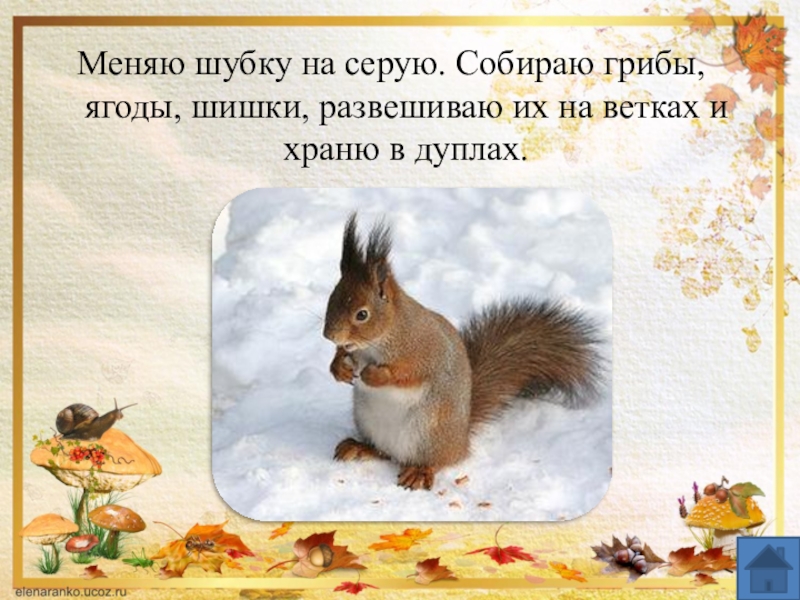 Меняю шубку на серую. Собираю грибы, ягоды, шишки, развешиваю их на ветках и храню в дуплах.