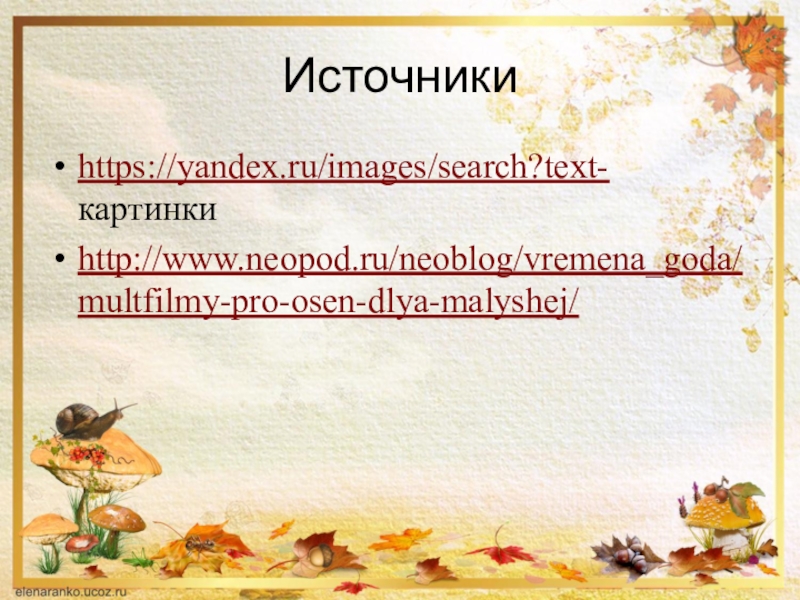 Источники https://yandex.ru/images/search?text- картинкиhttp://www.neopod.ru/neoblog/vremena_goda/multfilmy-pro-osen-dlya-malyshej/