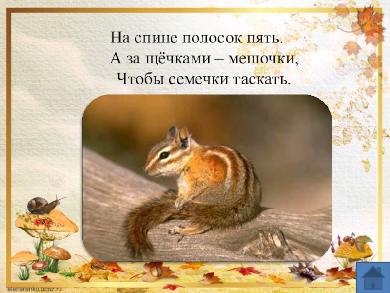 Слайд 19На спине полосок пять. А за щёчками – мешочки, Чтобы семечки таскать.