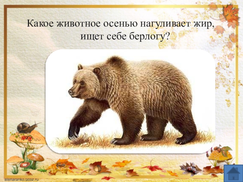 Слайд 17Какое животное осенью нагуливает жир, ищет себе берлогу?