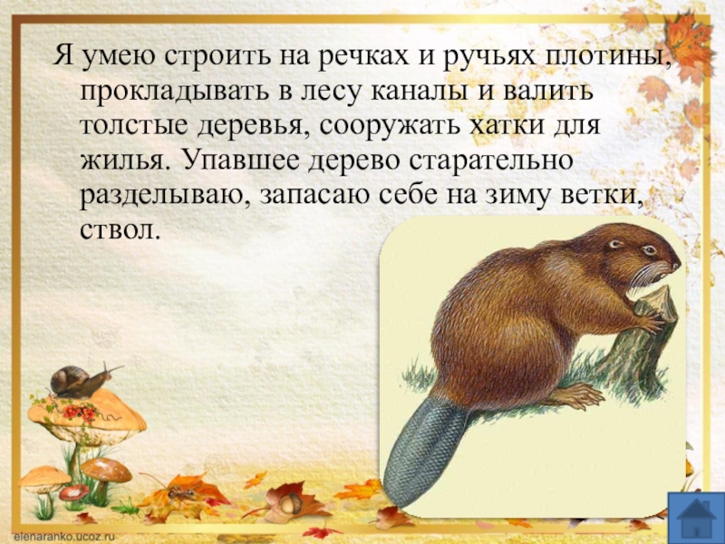 Я умею строить на речках и ручьях плотины, прокладывать в лесу каналы и валить толстые деревья, сооружать