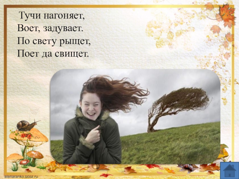 Слайд 8 Тучи нагоняет,  Воет, задувает. По свету рыщет,  Поет да свищет.