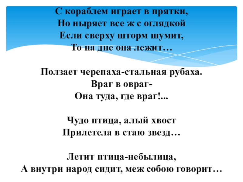 шторм шумит, То на дне она лежит… Ползает черепаха-стальная рубаха. Враг в овраг- Она туда, где враг!... Чудо птица, алый хвост Прилетела в стаю звезд… Летит птица-небылица, А внутри народ сидит, меж собою говорит…