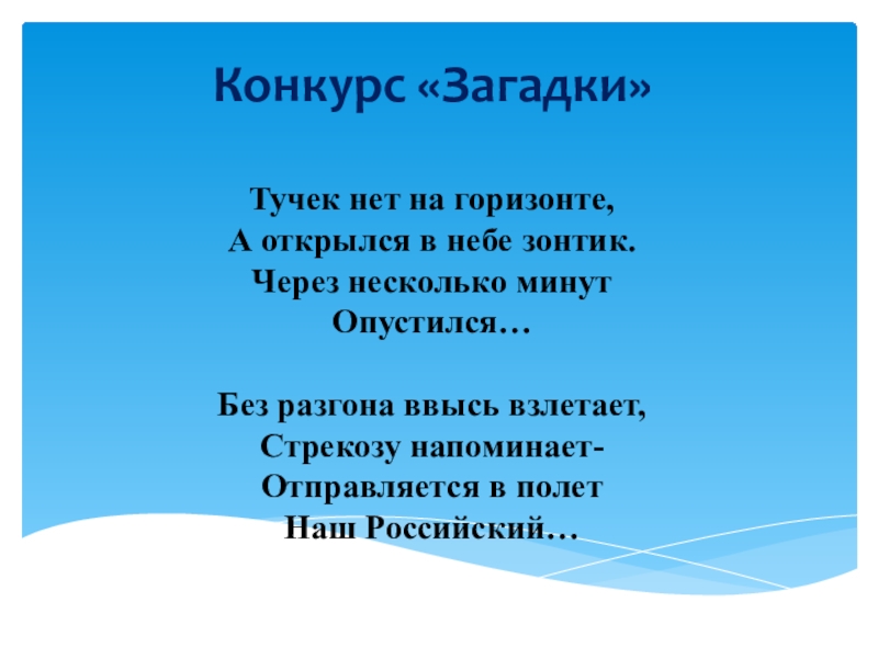 Конкурс «Загадки»  Тучек нет на горизонте, А открылся в небе зонтик. Через несколько минут Опустился…