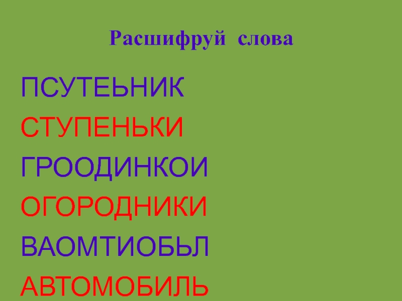 Расшифруй словаПСУТЕЬНИК СТУПЕНЬКИГРООДИНКОИОГОРОДНИКИВАОМТИОБЬЛАВТОМОБИЛЬ