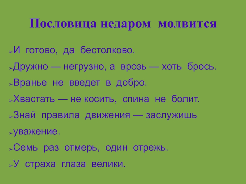 Пословица недаром молвитсяИ готово, да бестолково.Дружно — негрузно, а врозь — хоть брось.Вранье не введет в добро.Хвастать