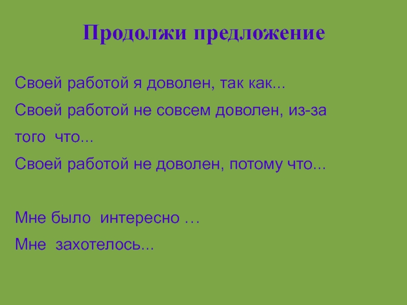 Продолжи предложениеСвоей работой я доволен, так как...Своей работой не совсем доволен, из-затого что...Своей работой не доволен, потому