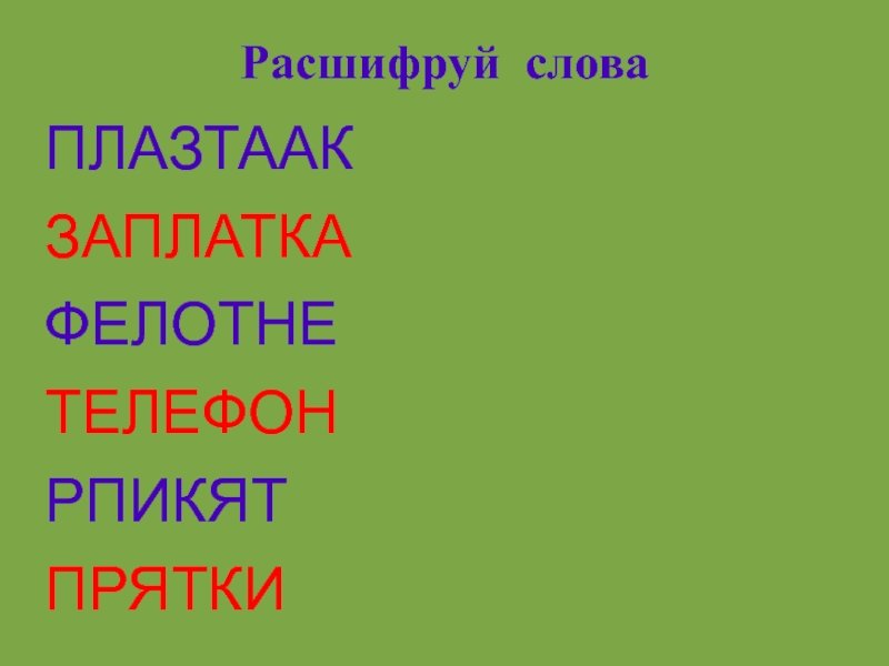 Расшифруй словаПЛАЗТААК   ЗАПЛАТКАФЕЛОТНЕ   ТЕЛЕФОНРПИКЯТ     ПРЯТКИ