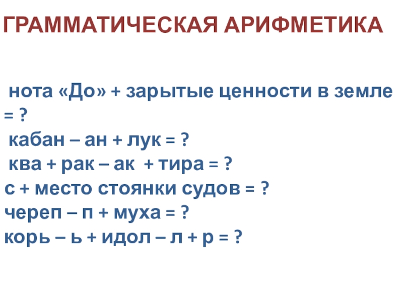 ГРАММАТИЧЕСКАЯ АРИФМЕТИКА нота «До» + зарытые ценности в земле = ? кабан – ан + лук =