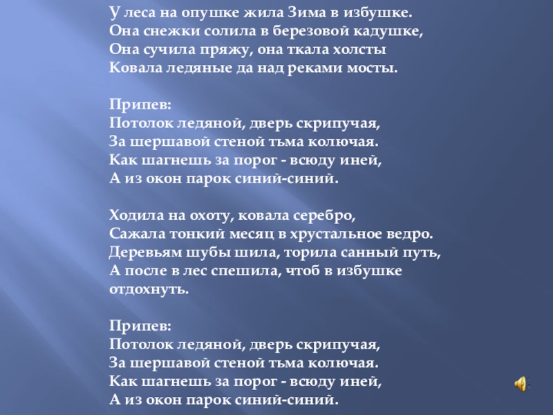 березовой кадушке, Она сучила пряжу, она ткала холсты Ковала ледяные да над реками мосты. Припев: Потолок ледяной, дверь скрипучая, За шершавой стеной тьма колючая. Как шагнешь за порог - всюду иней, А из окон парок синий-синий. Ходила на охоту, ковала серебро, Сажала тонкий месяц в хрустальное ведро. Деревьям шубы шила, торила санный путь, А после в лес спешила, чтоб в избушке отдохнуть. Припев: Потолок ледяной, дверь скрипучая, За шершавой стеной тьма колючая. Как шагнешь за порог - всюду иней, А из окон парок синий-синий.