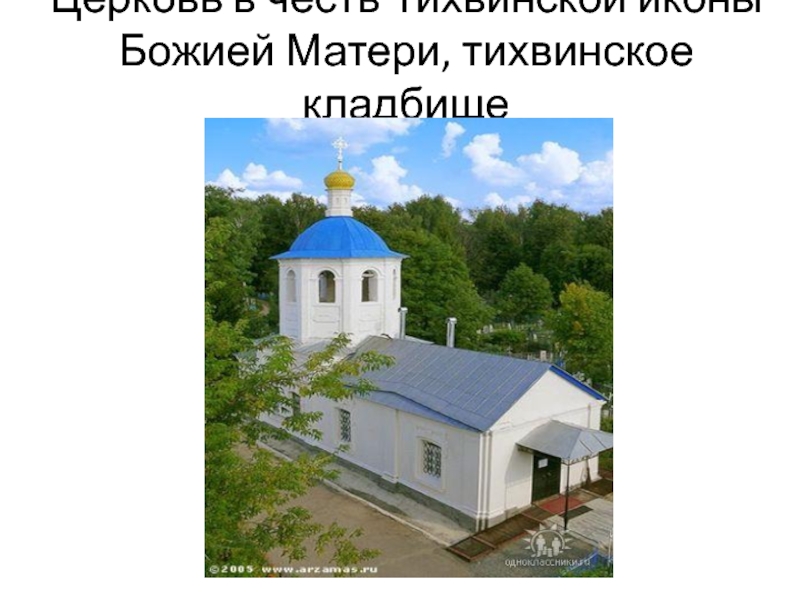 Слайд 19Церковь в честь Тихвинской иконы Божией Матери, тихвинское кладбище