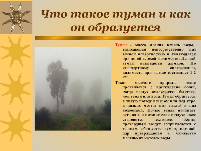 Такое явление природы чаще проявляется с наступление осени, когда воздух охлаждается быстрее, чем земля или вода. Туман образуется в тихую погоду вечером или под утро в низких местах над землей и над водоемами. Ночью земля начинает остывать и нижние слои воздуха тоже становятся холоднее. Когда прохладный воздух соприкасается с теплым, образуется туман, водяной пар превращается в множество маленьких капелек воды.