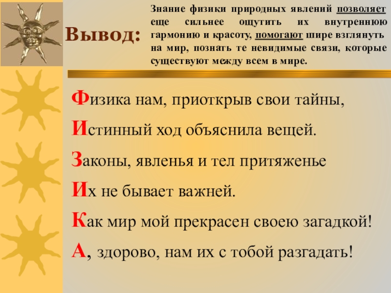 Знание физики природных явлений позволяет еще сильнее ощутить их внутреннюю гармонию и красоту, помогают шире взглянуть на мир, познать те невидимые связи, которые существуют между всем в мире.