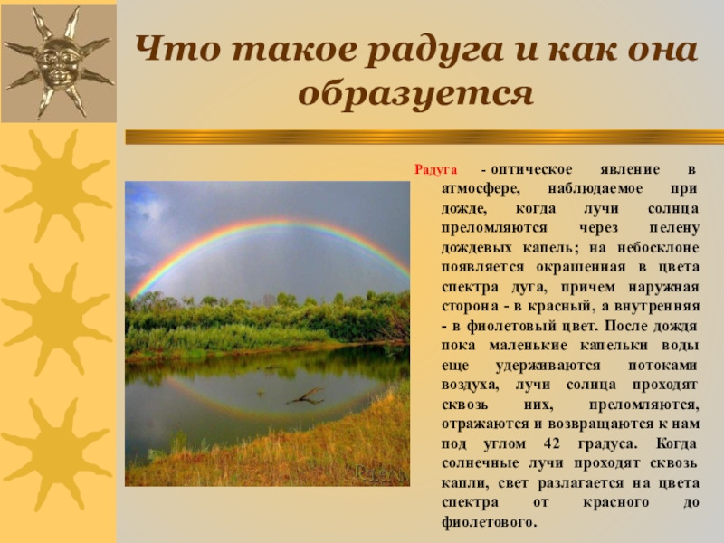 наблюдаемое при дожде, когда лучи солнца преломляются через пелену дождевых капель; на небосклоне появляется окрашенная в цвета спектра дуга, причем наружная сторона - в красный, а внутренняя - в фиолетовый цвет. После дождя пока маленькие капельки воды еще удерживаются потоками воздуха, лучи солнца проходят сквозь них, преломляются, отражаются и возвращаются к нам под углом 42 градуса. Когда солнечные лучи проходят сквозь капли, свет разлагается на цвета спектра от красного до фиолетового.