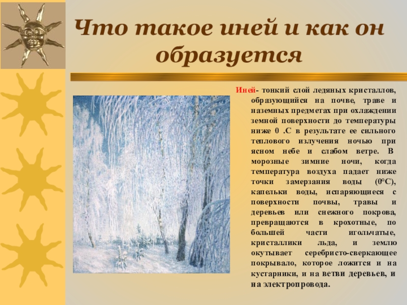 образующийся на почве, траве и наземных предметах при охлаждении земной поверхности до температуры ниже 0 .С в результате ее сильного теплового излучения ночью при ясном небе и слабом ветре. В морозные зимние ночи, когда температура воздуха падает ниже точки замерзания воды (0°C), капельки воды, испаряющиеся с поверхности почвы, травы и деревьев или снежного покрова, превращаются в крохотные, по большей части игольчатые, кристаллики льда, и землю окутывает серебристо-сверкающее покрывало, которое ложится и на кустарники, и на ветви деревьев, и на электропровода.