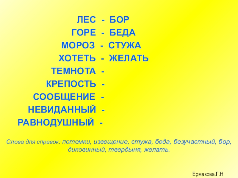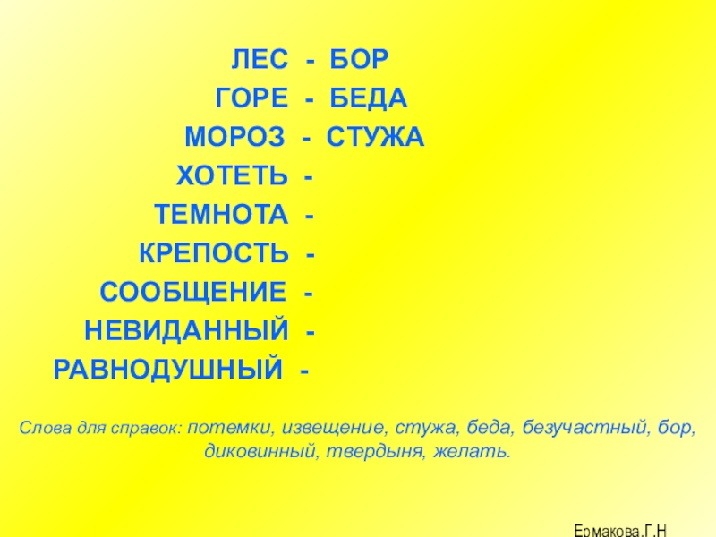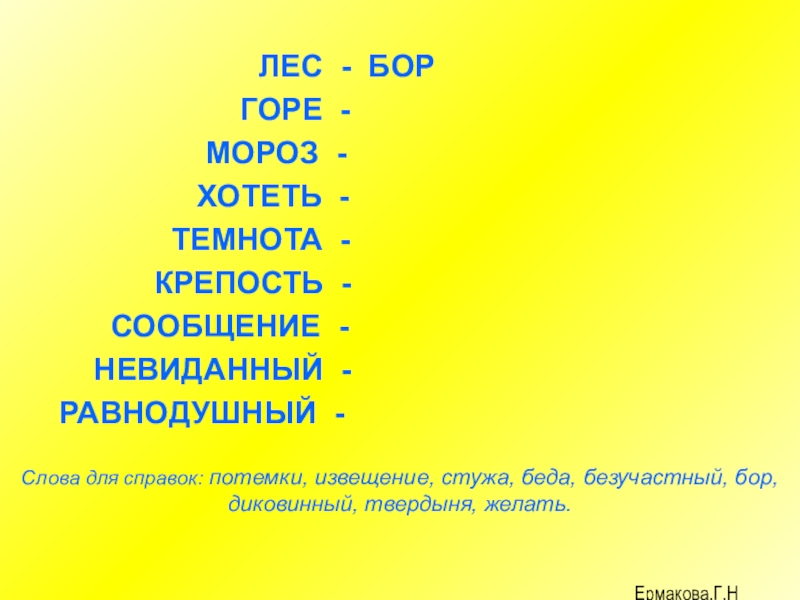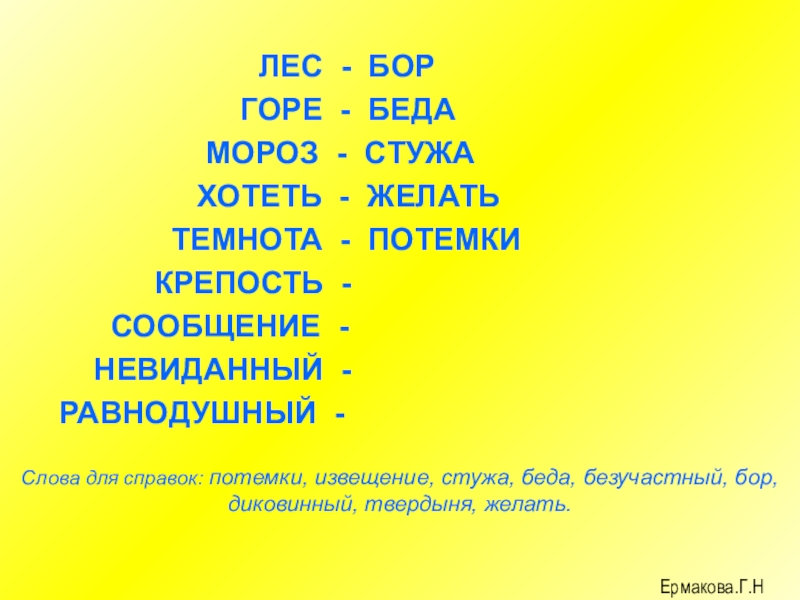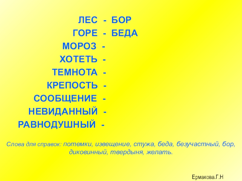 Слова для справок: потемки, извещение, стужа, беда, безучастный, бор, диковинный, твердыня, желать.