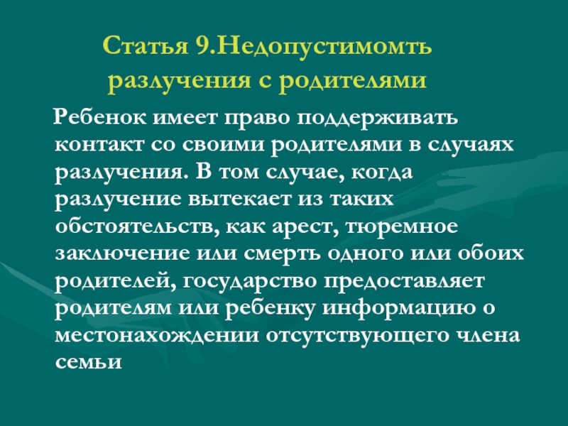 случаях разлучения. В том случае, когда разлучение вытекает из таких обстоятельств, как арест, тюремное заключение или смерть одного или обоих родителей, государство предоставляет родителям или ребенку информацию о местонахождении отсутствующего члена семьи