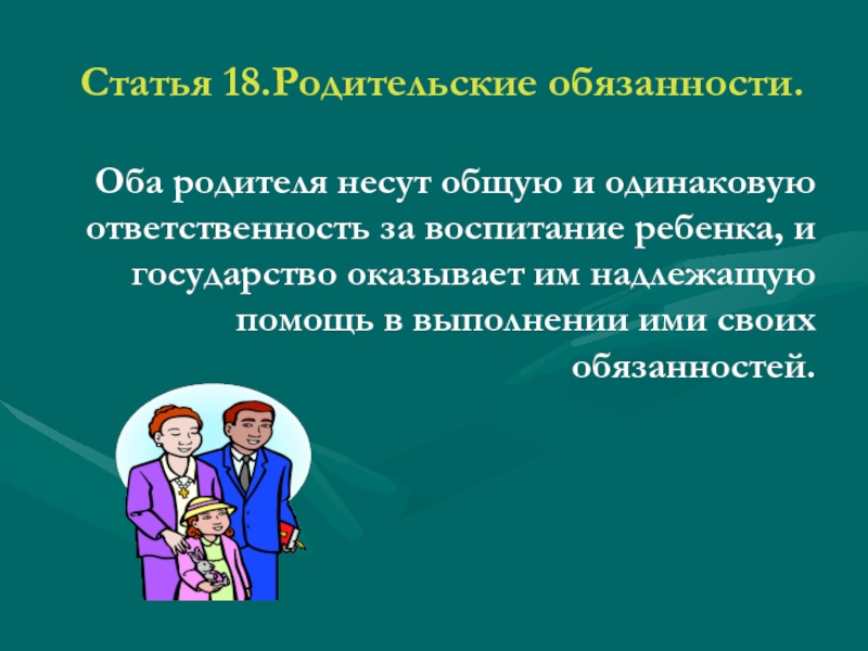 ребенка, и государство оказывает им надлежащую помощь в выполнении ими своих обязанностей.