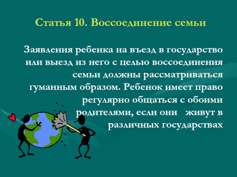 или выезд из него с целью воссоединения семьи должны рассматриваться гуманным образом. Ребенок имеет право регулярно общаться с обоими родителями, если они живут в различных государствах