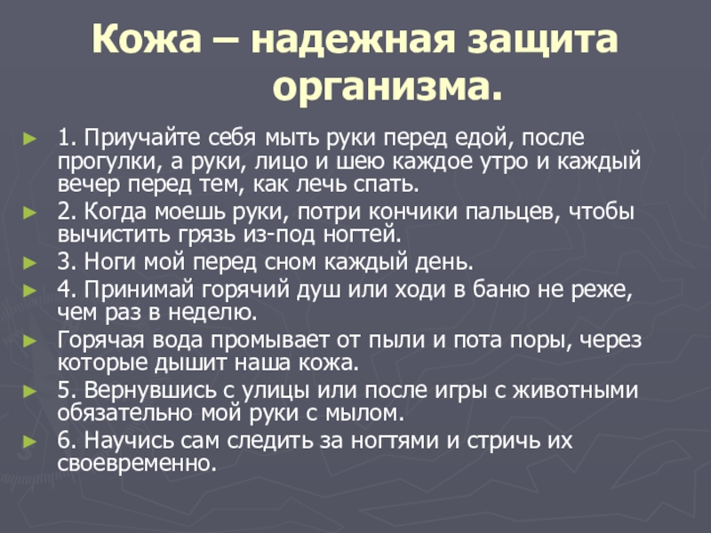 Кожа – надежная защита организма.1. Приучайте себя мыть руки перед едой, после прогулки, а руки, лицо и шею каждое утро и каждый вечер перед тем, как лечь спать.2. Когда моешь руки, потри кончики пальцев, чтобы вычистить