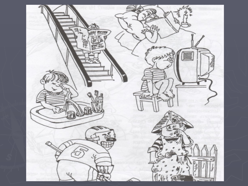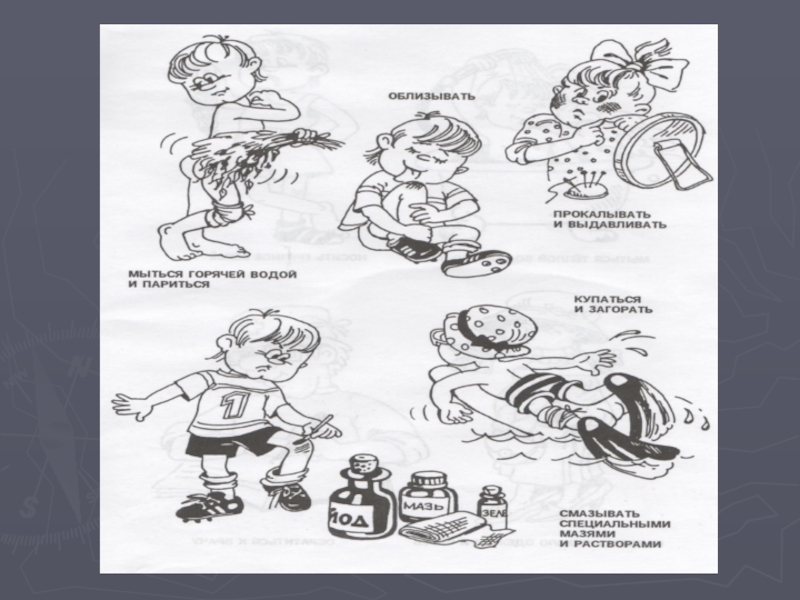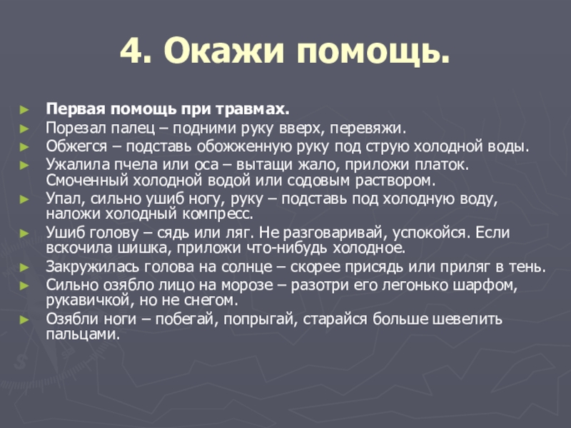 4. Окажи помощь.Первая помощь при травмах.Порезал палец – подними руку вверх, перевяжи.Обжегся – подставь обожженную руку под