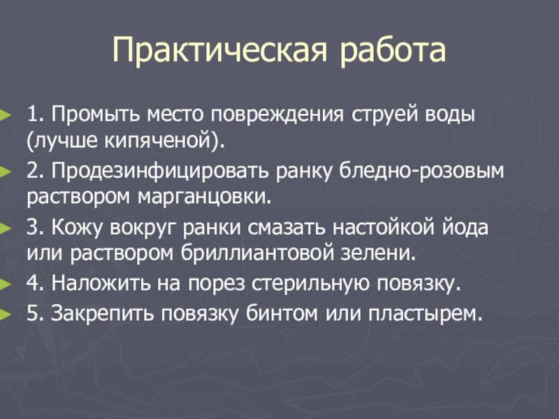 Практическая работа1. Промыть место повреждения струей воды (лучше кипяченой).2. Продезинфицировать ранку бледно-розовым раствором марганцовки.3. Кожу вокруг ранки