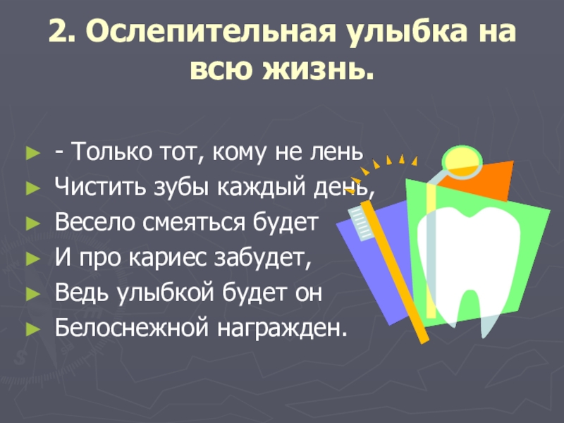 2. Ослепительная улыбка на всю жизнь.- Только тот, кому не леньЧистить зубы каждый день,Весело смеяться будетИ про