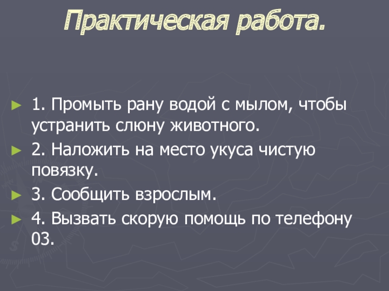 Практическая работа. 1. Промыть рану водой с мылом, чтобы устранить слюну животного.2. Наложить на место укуса чистую