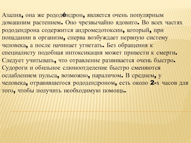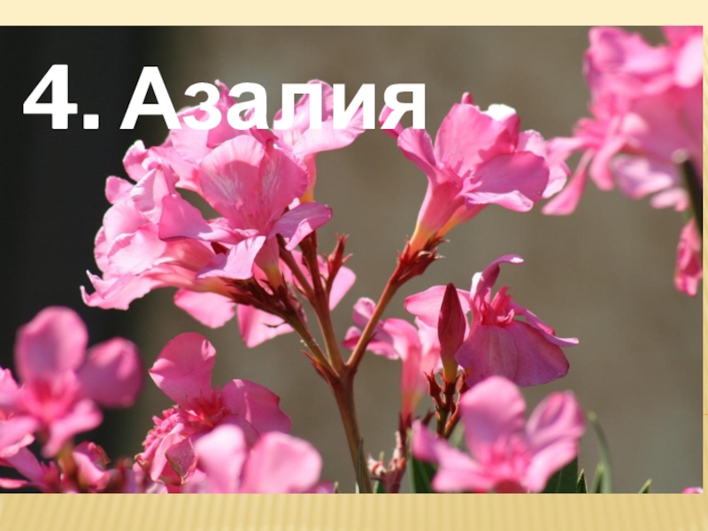 Слайд 15Азалия, она же рододéндрон, является очень популярным домашним растением. Оно чрезвычайно