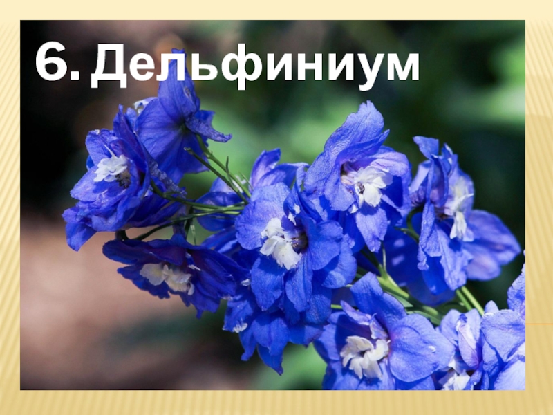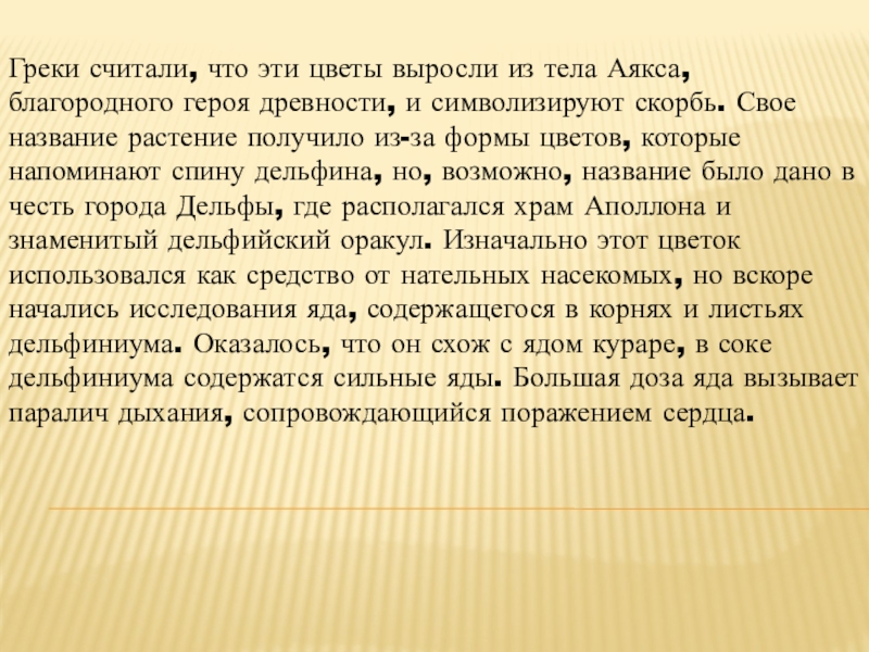 древности, и символизируют скорбь. Свое название растение получило из-за формы цветов, которые напоминают спину дельфина, но, возможно, название было дано в честь города Дельфы, где располагался храм Аполлона и знаменитый дельфийский оракул. Изначально этот цветок использовался как средство от нательных насекомых, но вскоре начались исследования яда, содержащегося в корнях и листьях дельфиниума. Оказалось, что он схож с ядом кураре, в соке дельфиниума содержатся сильные яды. Большая доза яда вызывает паралич дыхания, сопровождающийся поражением сердца.