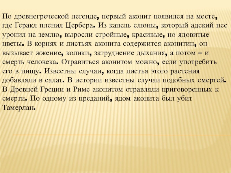 Цербера. Из капель слюны, который адский пес уронил на землю, выросли стройные, красивые, но ядовитые цветы. В корнях и листьях аконита содержится аконитин, он вызывает жжение, колики, затруднение дыхания, а потом – и смерть человека. Отравиться аконитом можно, если употребить его в пищу. Известны случаи, когда листья этого растения добавляли в салат. В истории известны случаи подобных смертей. В Древней Греции и Риме аконитом отравляли приговоренных к смерти. По одному из преданий, ядом аконита был убит Тамерлан.