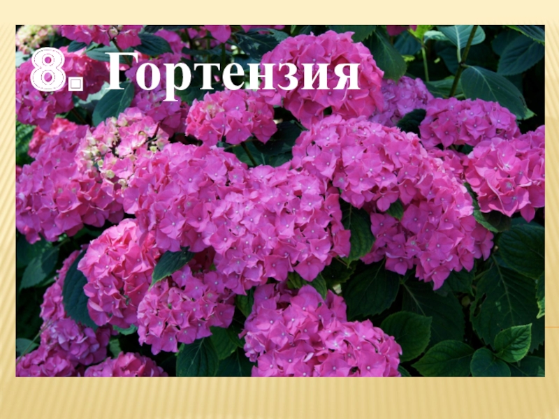 Слайд 7Гортензия – красивый цветок. Он цветет с весны до осени, любит