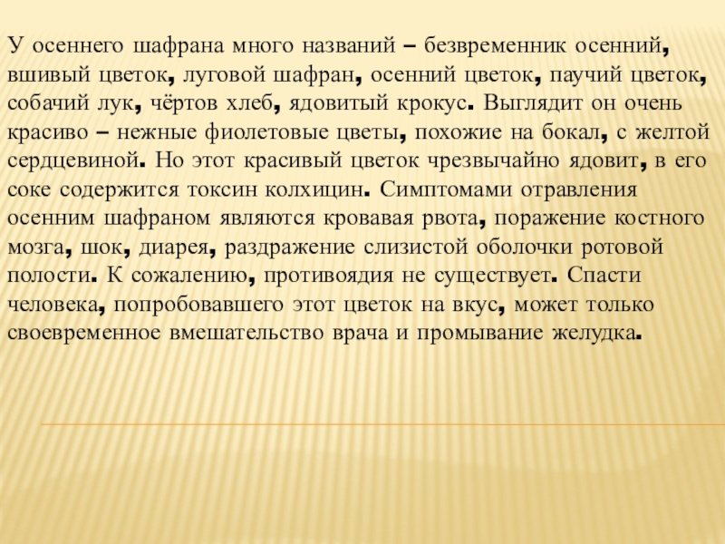 шафран, осенний цветок, паучий цветок, собачий лук, чёртов хлеб, ядовитый крокус. Выглядит он очень красиво – нежные фиолетовые цветы, похожие на бокал, с желтой сердцевиной. Но этот красивый цветок чрезвычайно ядовит, в его соке содержится токсин колхицин. Симптомами отравления осенним шафраном являются кровавая рвота, поражение костного мозга, шок, диарея, раздражение слизистой оболочки ротовой полости. К сожалению, противоядия не существует. Спасти человека, попробовавшего этот цветок на вкус, может только своевременное вмешательство врача и промывание желудка.