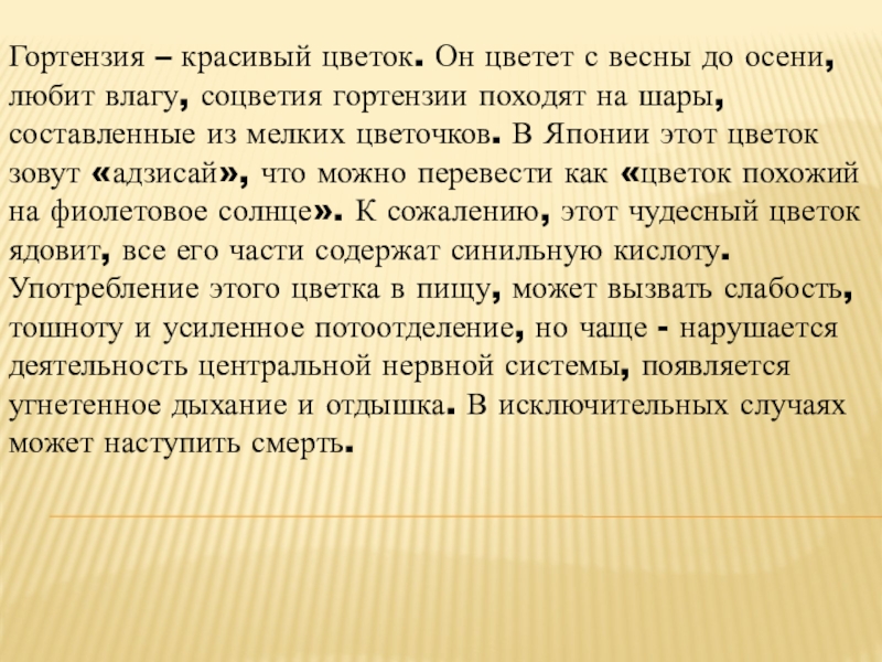 влагу, соцветия гортензии походят на шары, составленные из мелких цветочков. В Японии этот цветок зовут «адзисай», что можно перевести как «цветок похожий на фиолетовое солнце». К сожалению, этот чудесный цветок ядовит, все его части содержат синильную кислоту. Употребление этого цветка в пищу, может вызвать слабость, тошноту и усиленное потоотделение, но чаще - нарушается деятельность центральной нервной системы, появляется угнетенное дыхание и отдышка. В исключительных случаях может наступить смерть.