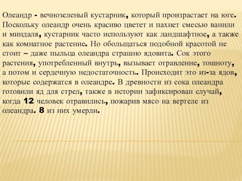 Слайд 19Олеандр - вечнозеленый кустарник, который произрастает на юге. Поскольку олеандр очень
