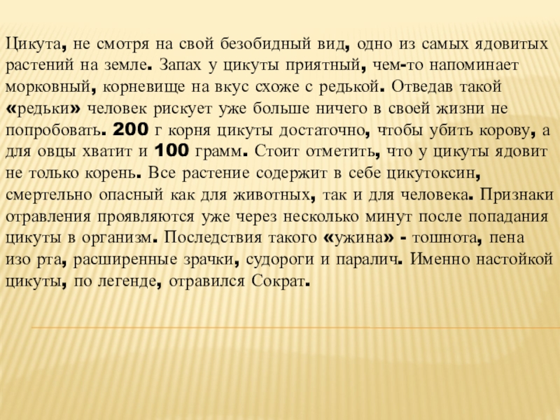 растений на земле. Запах у цикуты приятный, чем-то напоминает морковный, корневище на вкус схоже с редькой. Отведав такой «редьки» человек рискует уже больше ничего в своей жизни не попробовать. 200 г корня цикуты достаточно, чтобы убить корову, а для овцы хватит и 100 грамм. Стоит отметить, что у цикуты ядовит не только корень. Все растение содержит в себе цикутоксин, смертельно опасный как для животных, так и для человека. Признаки отравления проявляются уже через несколько минут после попадания цикуты в организм. Последствия такого «ужина» - тошнота, пена изо рта, расширенные зрачки, судороги и паралич. Именно настойкой цикуты, по легенде, отравился Сократ.