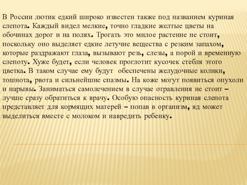 Слайд 5В России лютик едкий широко известен также под названием куриная слепота.