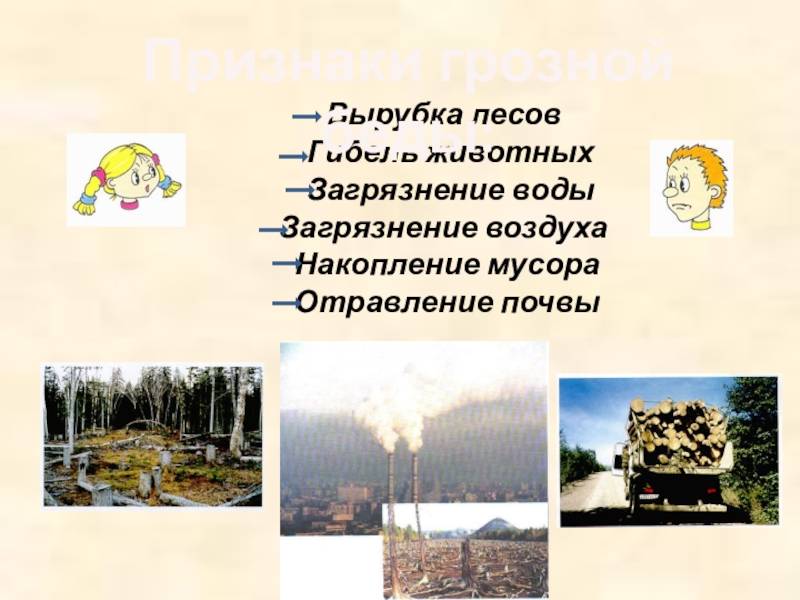 Вырубка лесов Гибель животных Загрязнение воды Загрязнение воздуха Накопление мусора Отравление почвы Признаки грозной беды: