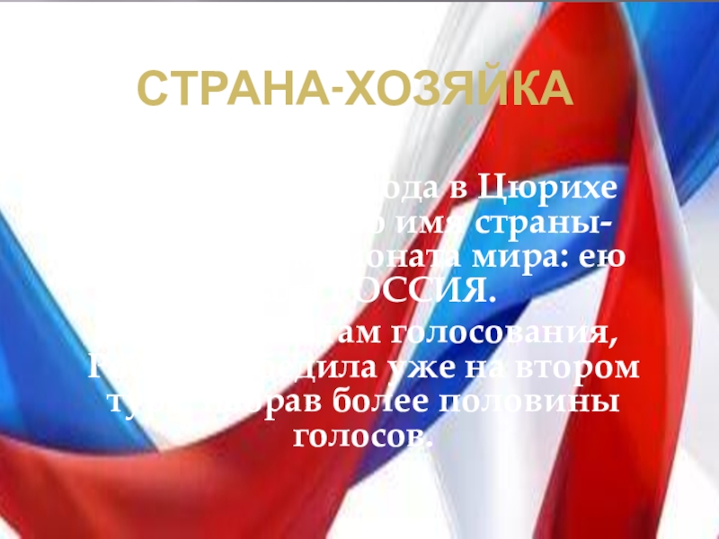 Страна-хозяйка2 декабря 2010 года в Цюрихе было оглашено имя страны-хозяйки чемпионата мира: ею стала РОССИЯ.По результатам голосования,