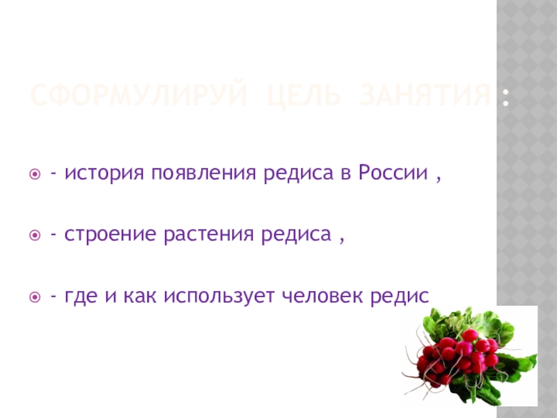 СФОРМУЛИРУЙ ЦЕЛЬ ЗАНЯТИЯ :- история появления редиса в России ,- строение растения редиса ,- где и как